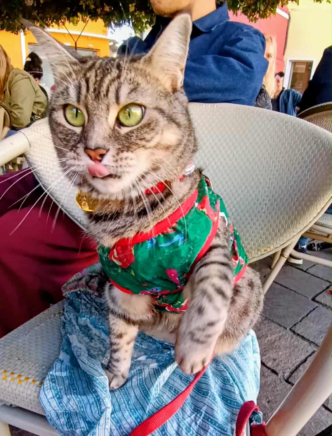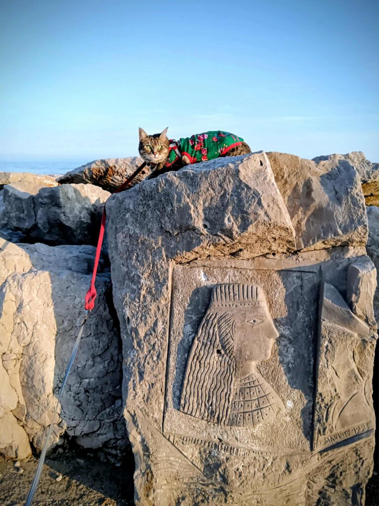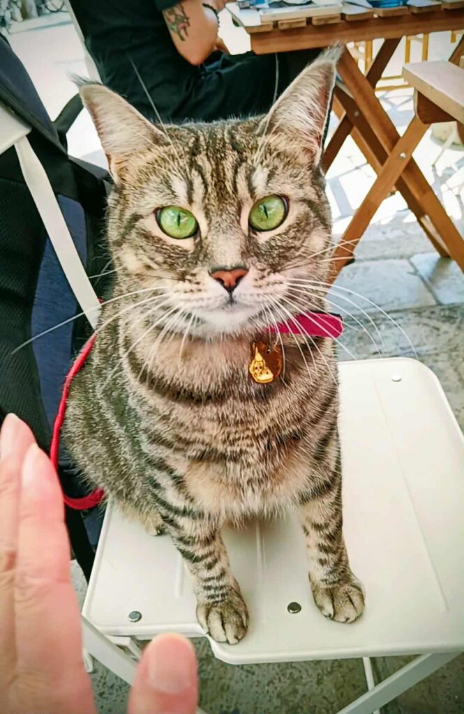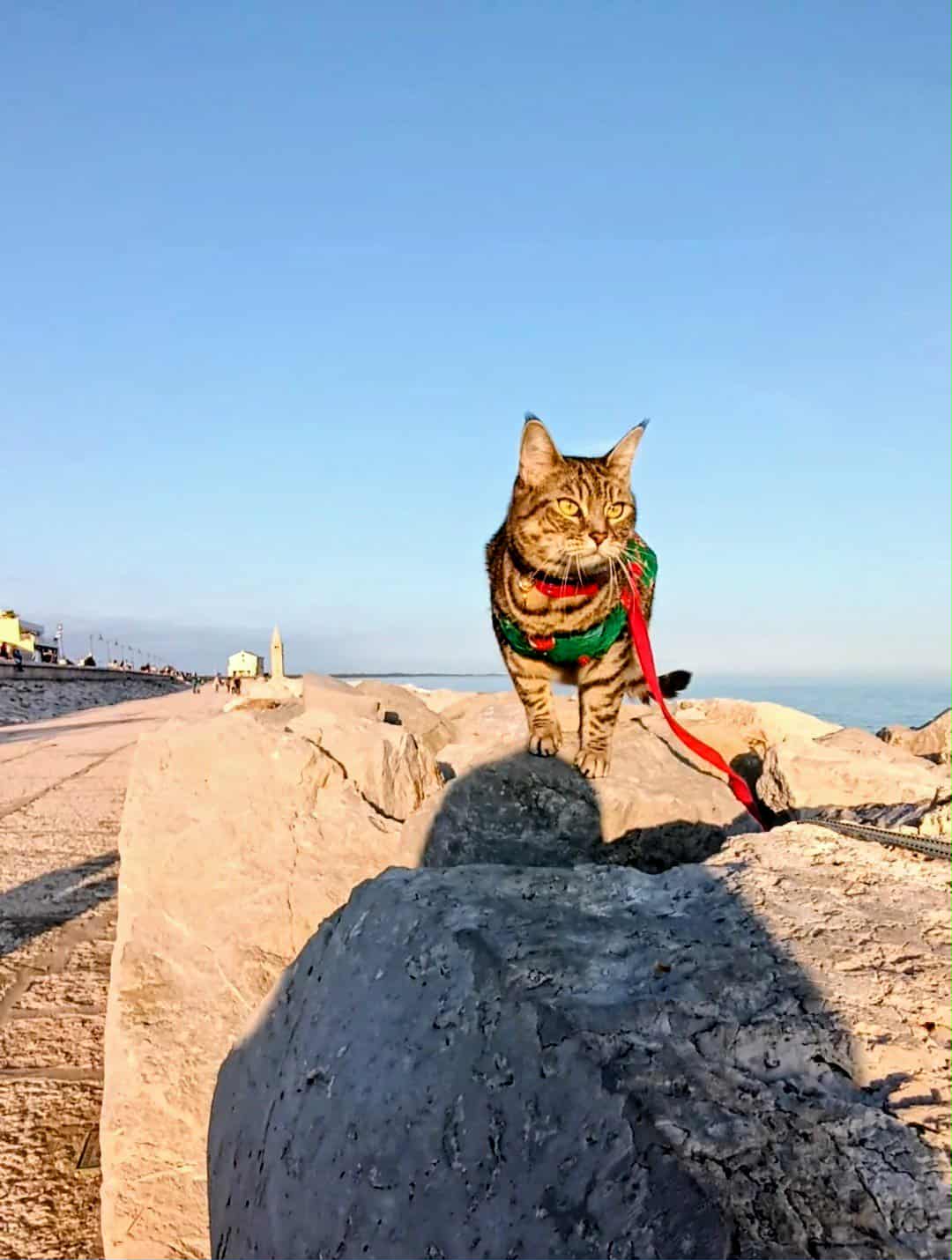Her daily sovereignty follows an unwavering rhythm: each morning begins with a dignified inspection from her backpack command centre, surveying both her human staff and the canine peasantry with detached interest. When the sun reaches its "dangerously sunny" hours (approximately 11:03 AM by her internal sundial), she retreats for a strategic siesta in the shadows, conserving energy like a tiny, furry solar panel. But come golden hour—when the light transforms everything into that perfect Instagram-gold hue—she makes her grand reappearance, stretching with the theatrical flair of a diva taking center stage. The day ends with a sundowner at the beach bar, where the clink of ice cubes harmonizes with the Adriatic's lullaby, and Gigia's regal patience is rewarded with abundant treats—because even the most discerning feline knows that paradise isn't complete without a side of snacks.